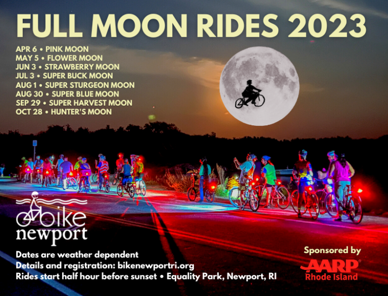 Bike Newport’s popular Full Moon Rides are delighting riders every month! We’re grateful to AARP Rhode Island for once again sponsoring this enjoyable series of scenic evening group rides, and we look forward to welcoming first-time and returning riders alike as we soak-in the moonlit beauty of our city by the sea.